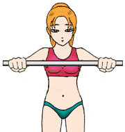 | 今回は前回に続いて、「なぜベンチプレスや腕立て伏せで肩を痛めるのか?」だが、ようするに腕を肩と水平にしなければよいだけである。右の絵をみてほしい。よくバーを下ろす位置をどのへんにもってくればいいという話があるが、オッパイの形など人によってちがう。むしろ肩の水平ラインと腕の角度をどのくらいとるかで考えた方がわかりやすい。だいたい30゜から60゜ぐらいの間でちようどよい。バーを下ろす位置が、息を吸い込んで胸がふくらみ大胸筋が最大限ストレッチされた状態での最も高い位置より少し鎖骨よりにするとだいたいちょうどよい角度のベストポジションがえられる。水平に近い方が大胸筋はよりストレッチされ、稼働域を大きくなるので、問題がなければもちろん30゜より上でもかまわない。絵でもわかるように、手と肘のラインを地面と垂直に保てば水平に近くなるほどグリップ幅は広くなる。あとは個人差で、一番効くポジションを自分でみつけていくしかない。 |