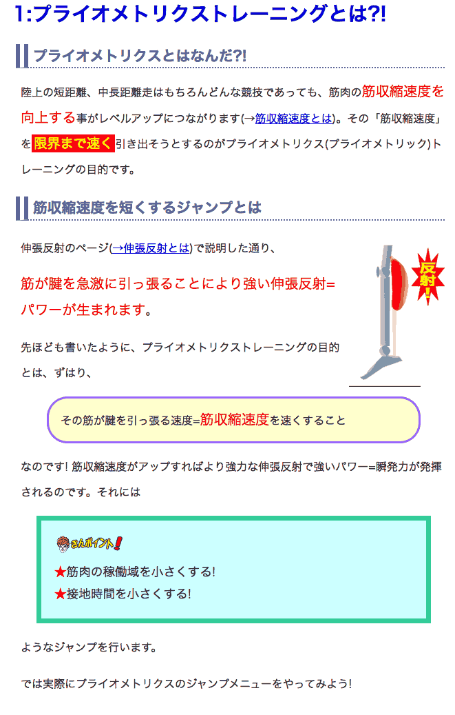 - 「つまりその筋が腱を引っ張る速度=筋収縮速度がアップすればより強力な伸張反射で強いパワー=瞬発力が発揮されるのです。」→ 「プライオメトリクストレーニングの目的は、その筋が腱を引っ張る速度=筋収縮速度を速くすることです。筋収縮速度がアップすればより強力な伸張反射で強いパワー=瞬発力が発揮されるのです。」に加筆修正→修正前