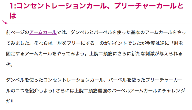 - タイトルを「コンセントレーションカールとプリーチャーカール - 上腕二頭筋をパンプアップさせる筋トレ」→「バーベルアームカール・コンセントレーションカール・プリーチャーカール - 上腕二頭筋をパンプアップさせる筋トレ」に変更